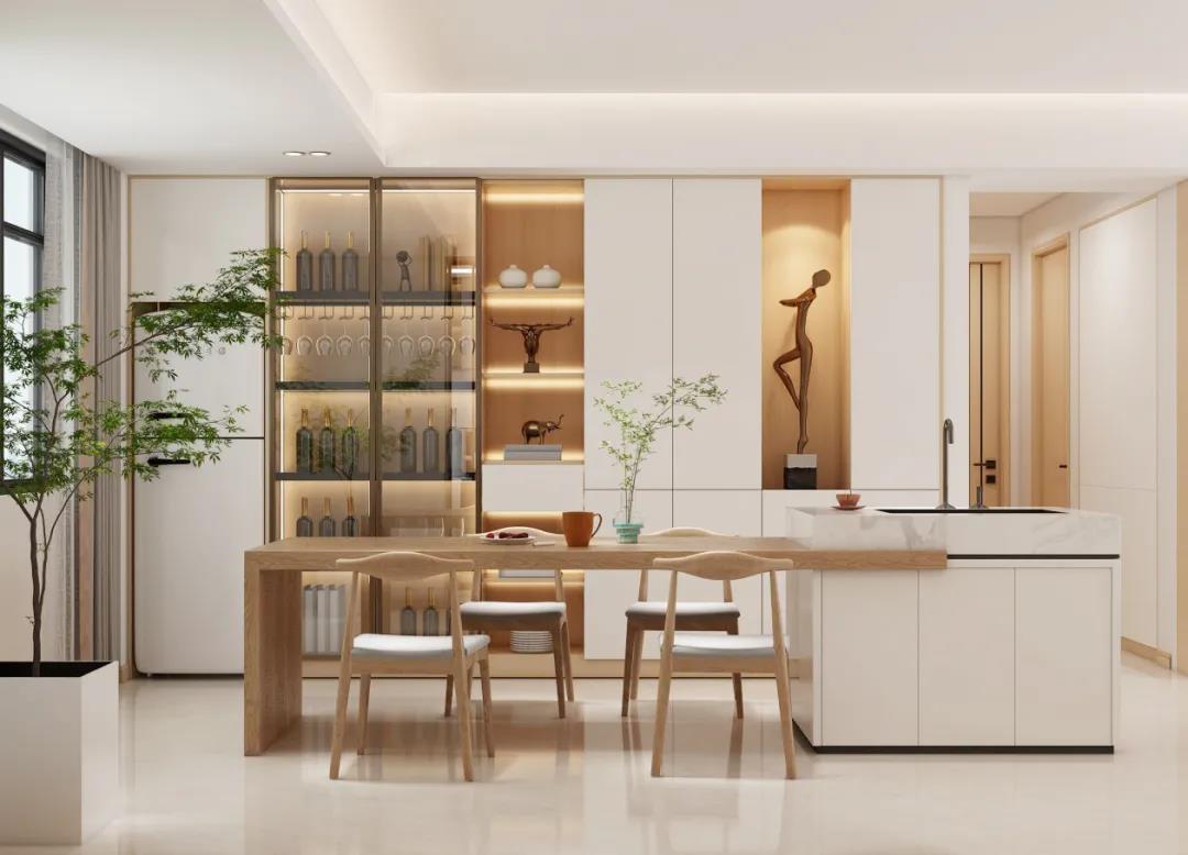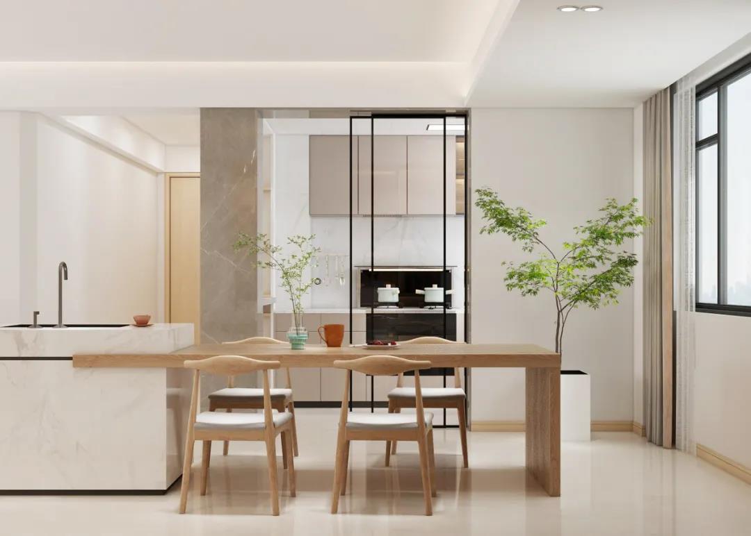 餐廳設(shè)計首先從色調(diào)上就充滿高級感,先以和暖的原木色與簡約白作主色,打造出一片時尚且大方的室內(nèi)背景,然后再借窗外上光線、有生機的植物元素,為空間勾出幾分寧靜與安逸,這點綴不在多但在精,輕輕數(shù)筆,點到即止。就能帶給居住者舒適實用的用餐環(huán)境。